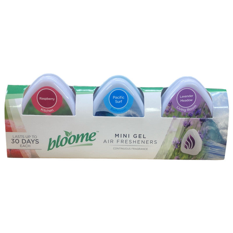 The Bloome Mini Gel Air Fresheners include three assorted fragrances: Raspberry, Pacific Surf & Lavender Meadow.