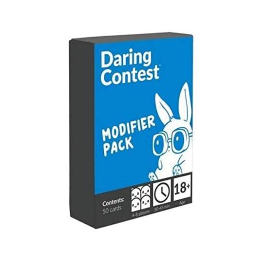 An adult party game designed to test your limits and your friendships Each player starts with five Dare cards Each round one player acts as the Judge and flips over a Modifier card which intensifies the dares The other players choose Dare cards from their hands that they are willing to perform with the Modifier Then the Judge reads them all and picks their favourite If the player successfully performs the dare they earn the points on the card and become the next Judge! Requires a copy of Daring Contest to play!